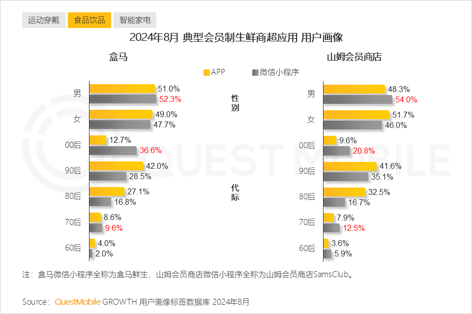 6、微信小程序助力生鲜商超类应用实现更多元人群的覆盖,为盒马和山姆会员商店均带来70后、00后男性的扩充