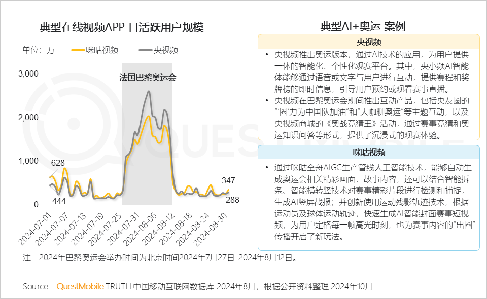 5、巴黎奥运会期间,典型视频平台开启“AI+奥运”的观赛模式,为用户创造更好的观看体验,从而促进咪咕视频、央视频APP流量的攀升