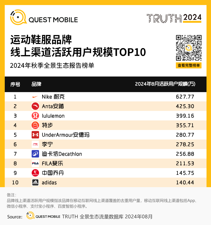 2、运动鞋服品牌线上渠道活跃用户规模TOP10