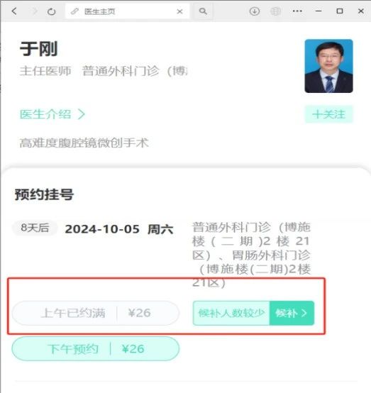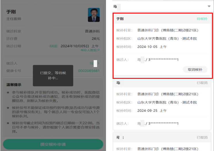 以该院普通外科主任医师于刚的门诊为例,当号源已约满时,挂号界面会出现候补挂号提示按钮。患者只需点击该按钮,系统便会显示当前的候补情况,如候补人数较少、中等或较多。确认后,患者需点击“提交候补申请”按钮,系统会自动跳转到候补记录界面,完成候补订单的提交。