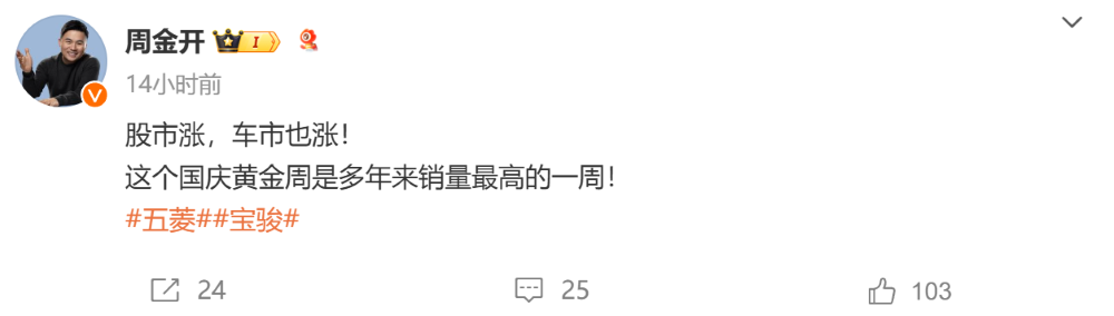 ▲周钘发文表示这个国庆黄金周是多年来销量最高的一周