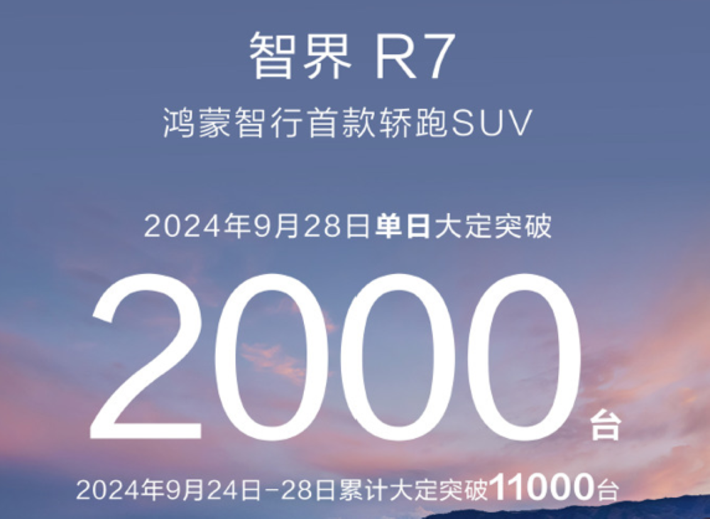 根据鸿蒙智行官方公布的数据,国庆10月1日至10月7日累计大定数突破28600台,其中智界R7大定突破9600台,问界M9大定突破7800台,问界M7突破9000台。