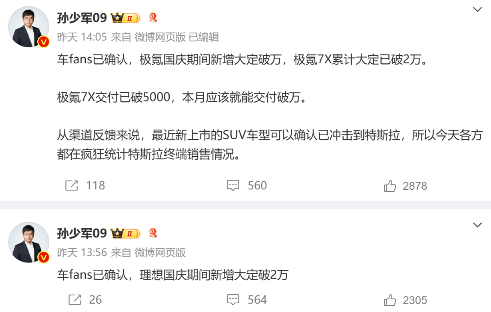 “孙少军09”还在社交媒体上透露,极氪汽车在国庆期间新增大定破万,极氪7X累计大定已破2万,交付已破5000辆,本月应该就能交付破万。