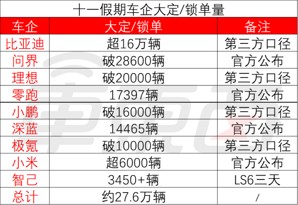 有一些车企没有官方公布国庆期间的锁单情况或者大定情况,但也从其他各种渠道中流出了锁单情况或者大定情况。