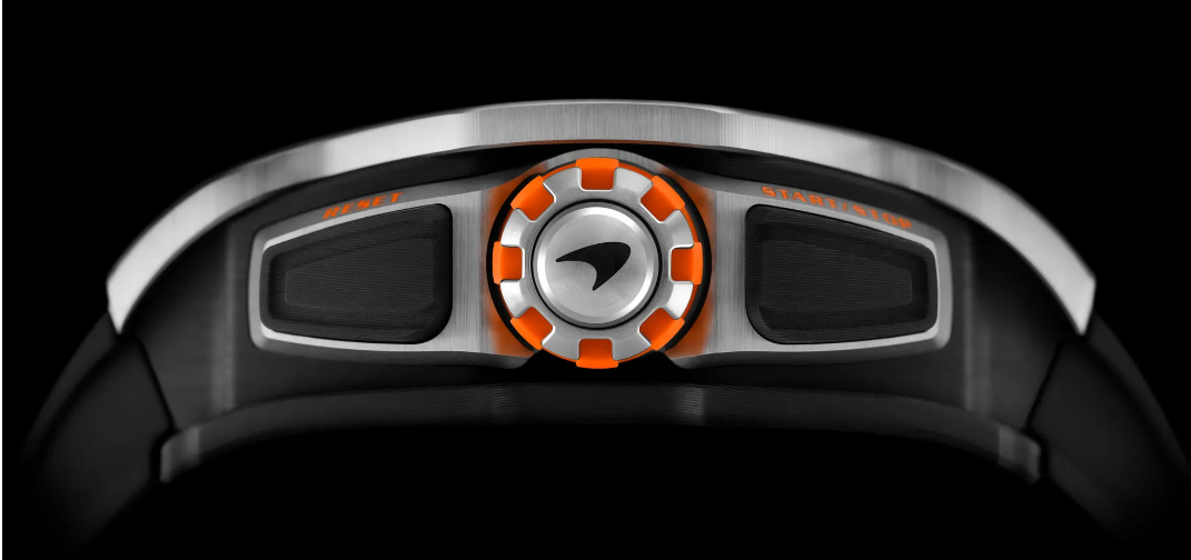 这款腕表在形状、材料、功能以及为其提供动力的“引擎”方面反映了W1超跑车的性格和特点。此款表冠专为RM 65-01 McLaren设计,采用五级钛金属打造,部分表冠覆有易于抓握的McLaren木瓜橙色橡胶涂层,尖端饰有 McLaren“Speedmark”标志。限量发行500枚。