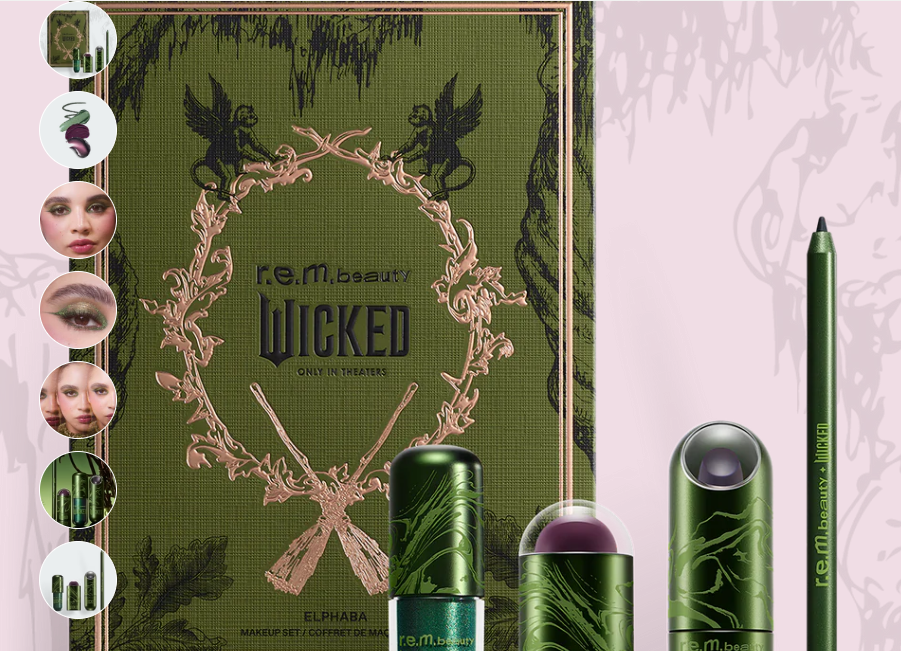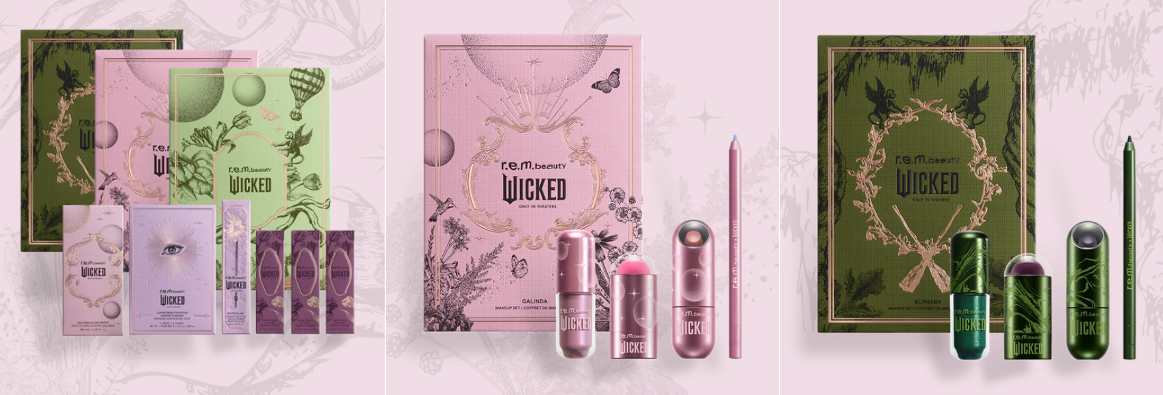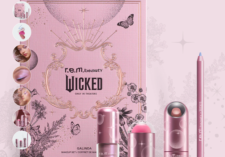 R.e.m.beauty以即将上映的电影《魔法坏女巫》的主题、人物、场景等为灵感,推出限量版彩妆胶囊系列。该系列共有九件产品,包含眼影盘、唇油、眼膜、唇彩等,可选择购买分主题彩妆套装,也可选择购买部分彩妆单品。Galinda彩妆套装灵感来自活泼的Galinda本人。套装包括带有金色珍珠质感的淡紫色金属唇膏、柔和薰衣草色的午夜阴影液体眼影、紫红色的唇颊棒、哑光冰蓝色的眼线笔等。