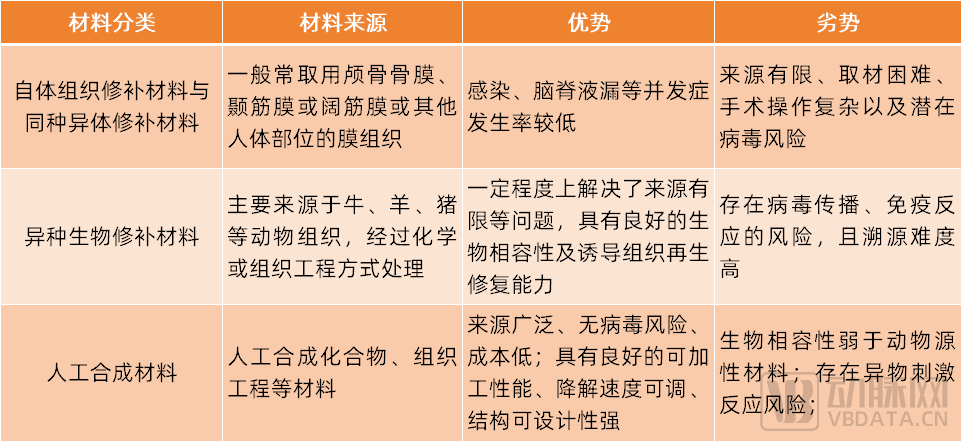据了解,硬脑(脊)膜补片是用于修补硬脑膜和(或)硬脊膜缺损的片状材料类产品。根据材料划分,可分为自体组织修补材料、同种异体修补材料、异种生物修补材料、人工合成材料。