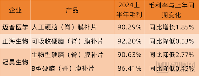需要注意的是,多次集采加上高国产化率,并没有让硬脑(脊)膜补片变成红海市场。多家上市企业最新财报显示,硬脑(脊)膜补片目前的毛利率约为90%。