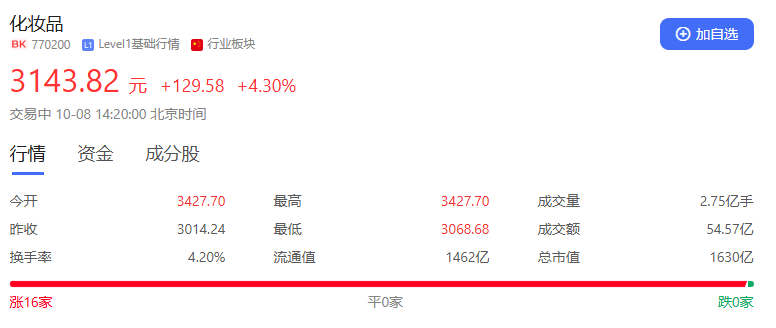截止9月30日,从申万行业来看,美容护理涨幅最大,高达14.08%,可以说是领涨。而在10月8日,百度股市通显示,包含珀莱雅、上海家化、丸美股份等16家美妆企业的化妆品行业板块,截止当日下午两点实现了4.23%的增幅,16家企业全线“飘红”。