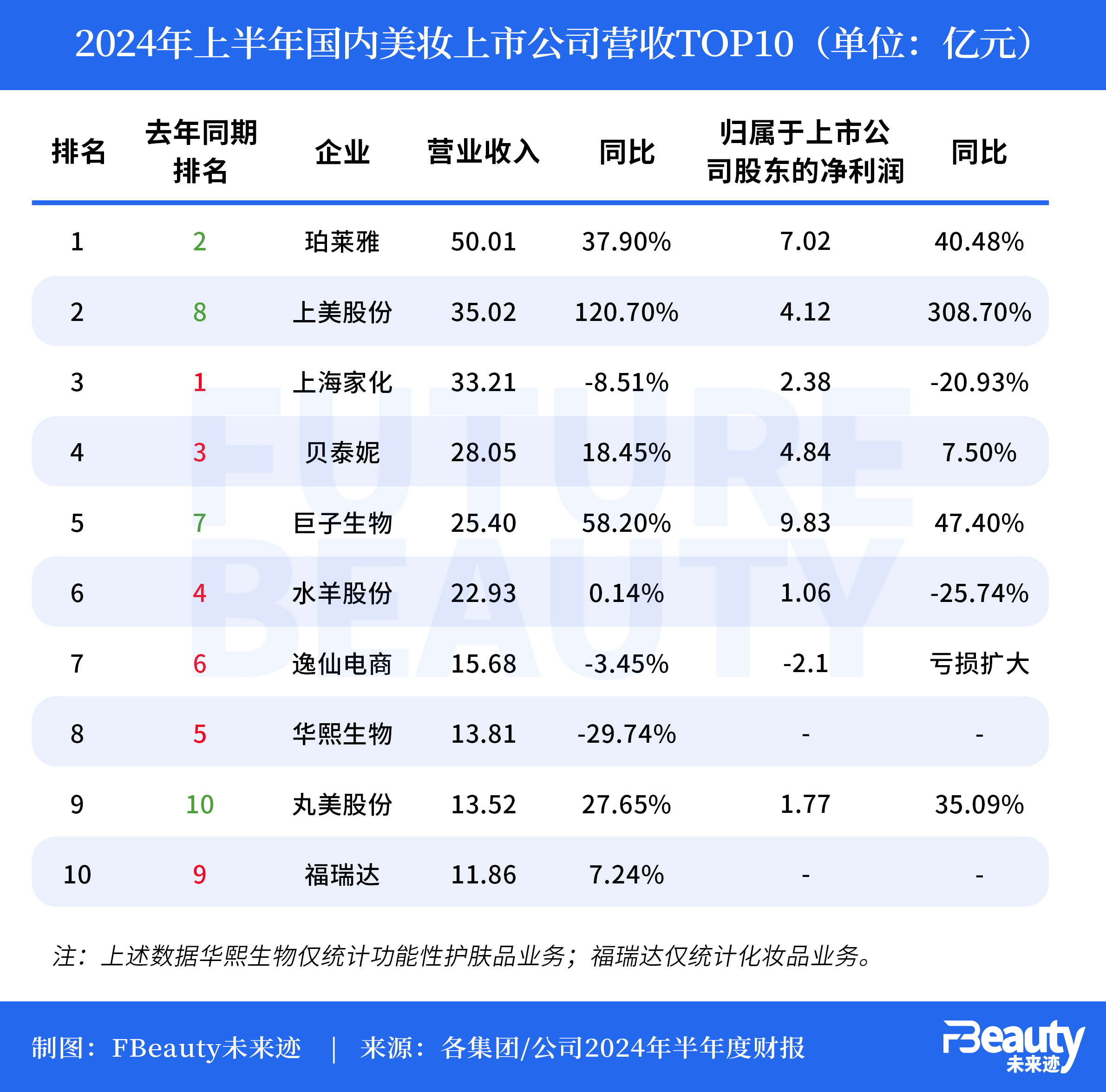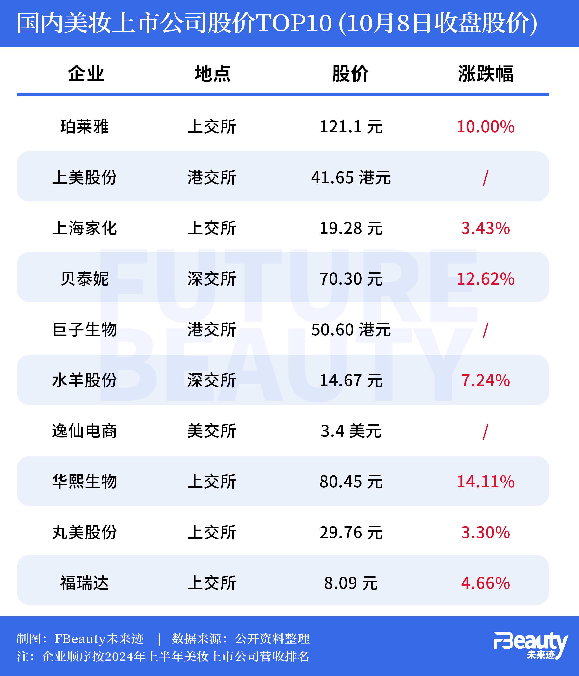 《FBeauty未来迹》整理发现,单就今年上半年国内美妆TOP10上市公司的表现来看,于国内上市的7家企业集体迎来了股价增长。