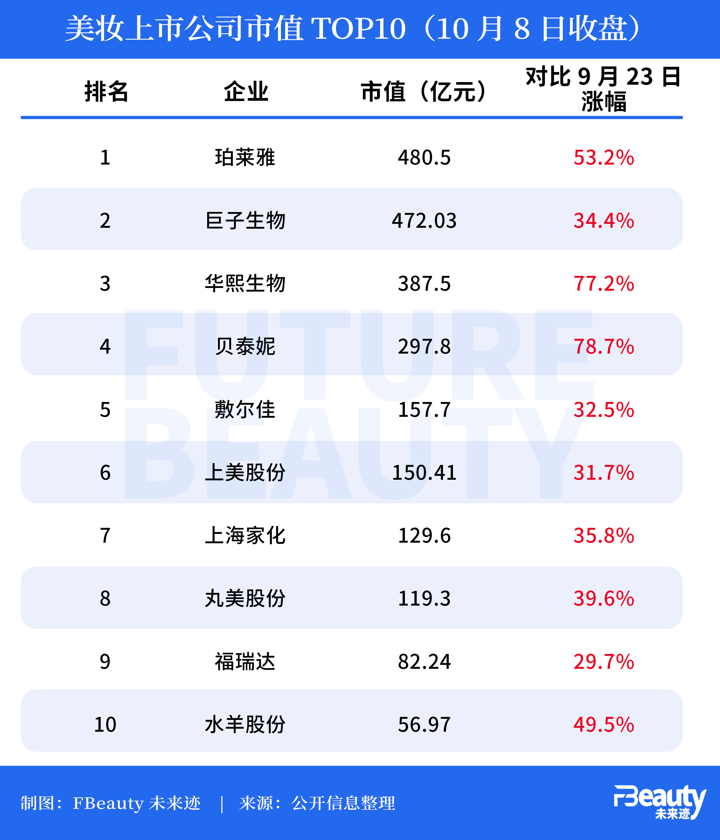 另外截至10月8日收盘,国内美妆上市公司市值对比9月已经迎来全新局面。其中珀莱雅以超480亿元市值成为美妆第一股,另外华熙生物、贝泰妮以超过70%的增幅成为市值增长最高的两家美妆公司,另外巨子生物、敷尔佳、上美股份、丸美股份、福瑞达和水羊股份的市值增幅也均超过或接近30%左右,综合来看,势头一片向好。