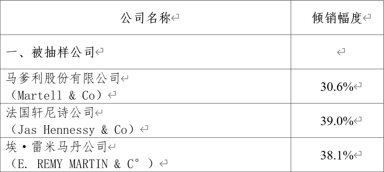 其中,3家被抽样公司中,马爹利股份有限公司(Martell & Co)为30.6%,法国轩尼诗公司(Jas Hennessy & Co)为39.0%,埃·雷米马丹公司(E. REMY MARTIN & C°)为38.1%。