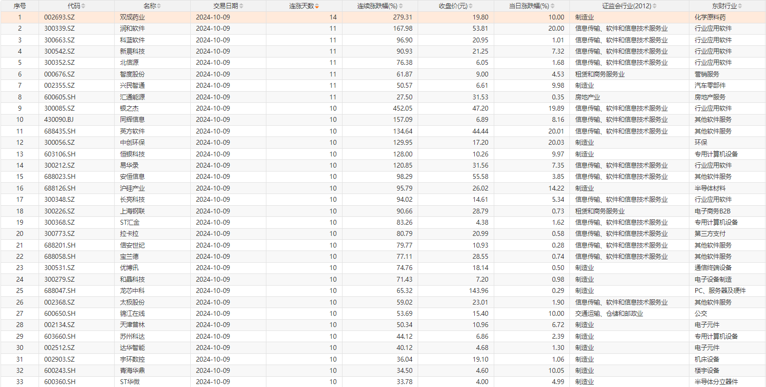 Choice数据统计,今日1只个股连续14天上涨,为双成药业;7只个股连续11天上涨,包括润和软件、科蓝软件、北信源等;此外,银之杰、同辉信息、中创环保等25只个股连续10天上涨。