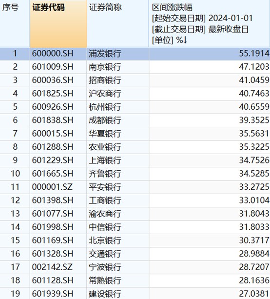 梳理银行股自2024年初以来的股价涨幅,整体银行板块上涨37%,其中浦发银行领涨板块,涨幅达到55.7%,南京银行以47.1%的涨幅紧随其后。涨幅居前多是城市商业银行。“四大行”中涨幅以农业银行的35.3%居首,其次是工商银行、中国银行和建设银行。