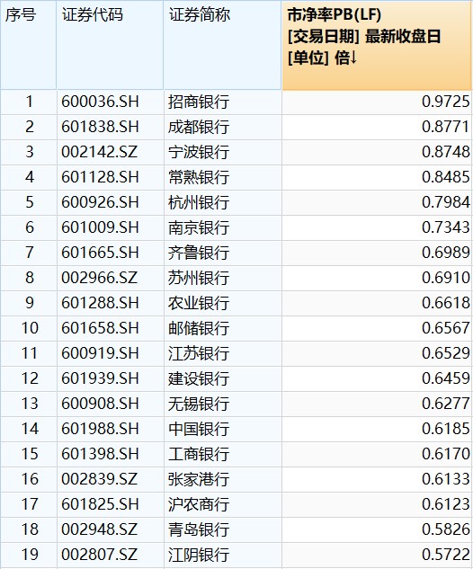 在全部银行股中,招商银行的市净率达到0.97倍,前几天市净率曾经突破1。紧随其后的是宁波银行和成都银行,市净率分别为0.88倍和0.87倍。多数银行的市净率只有0.6倍左右。“四大行”中农业银行的市净率最高,为0.66倍,工商银行的最低为0.62倍。