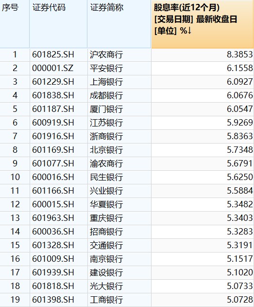 Wind数据显示,沪农商行的股息率高达8.3%是所有银行中最高的,多数银行股的股息率稳定在5%,远高于银行存货和理财产品的回报率,因此也吸引了大量追求稳定收益的长期资金的增持。“四大行”中工商银行和建设银行的股息率达到5%,叠加他们的市净率估值只有0.6倍左右,更加凸显了投资价值。