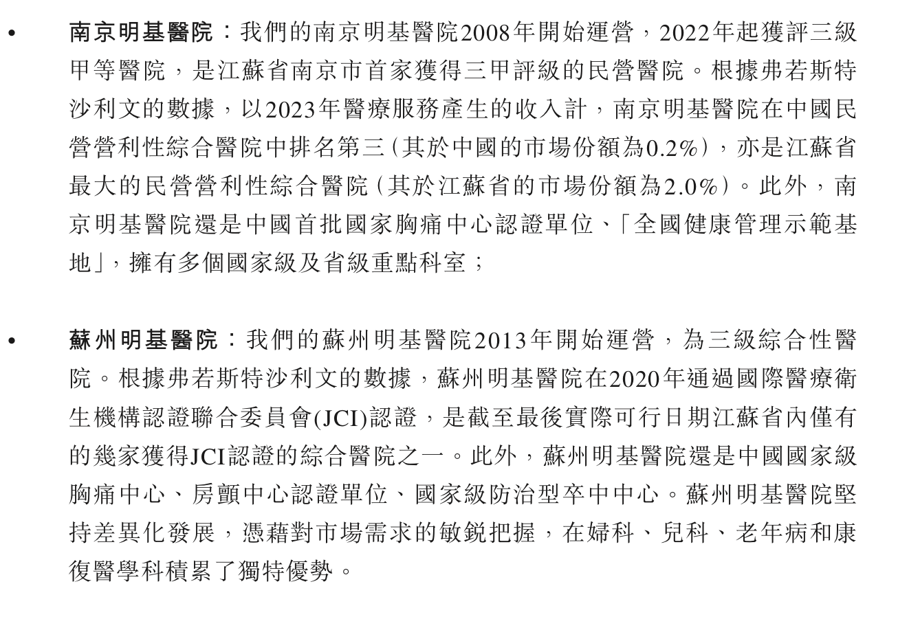 根据弗若斯特沙利文的数据,以2023年医疗服务产生的收入计算,明基医院是华东地区最大的民营营利性综合医院集团,于华东地区的市场份额为1.1%;以相同口径计算,在全国民营营利性综合医院集团中,明基医院排名第七,于中国的市场份额为0.4%;以2023年的床均收入计算,明基医院在中国内地所有民营营利性综合医院集团中排名第一。