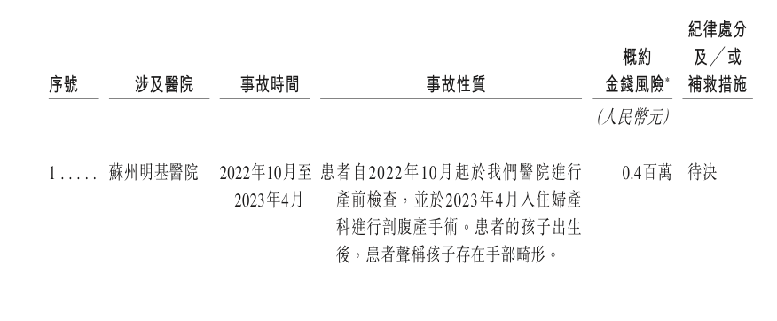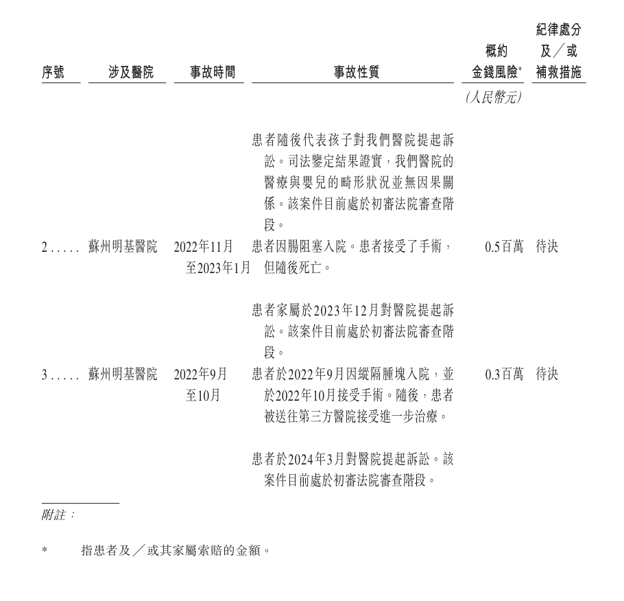 于金额方面,267起医疗纠纷中的26起的每起索赔、法院判決或赔偿金额超超过人民币30万元。截至最后实际可行日期,该等26起医疗纠纷中的3起尚未解决。