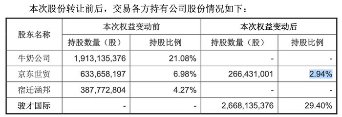 此次永辉超市股权的出让方有三家,分别是牛奶公司、京东世贸和宿迁涵邦。其中牛奶公司出让前持有永辉超市21.08%的股权,京东世贸和宿迁涵邦为一致行动人,同属于京东,出让前分别持有永辉超市6.98%和4.27%的股权,合计持股11.25%。