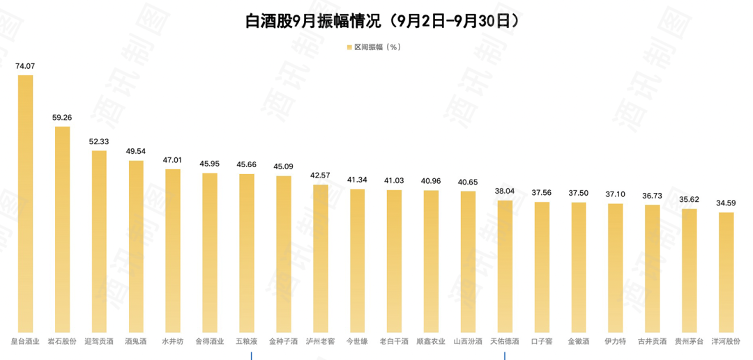 从涨幅来看,9月白酒板块20只白酒股均录得区间上涨,涨幅区间在34.59%—74.07%。要知道,20只白酒股在此之前的8个月里整体录得区间下跌,得服在9.30%—56.20%。而经过9月的一场“翻身仗”之后,已有五粮液、迎驾贡酒、口子窖、今世缘、老白干酒、贵州茅台等6只个股年内振幅回正,涨幅在3.12%—19.81%之间。