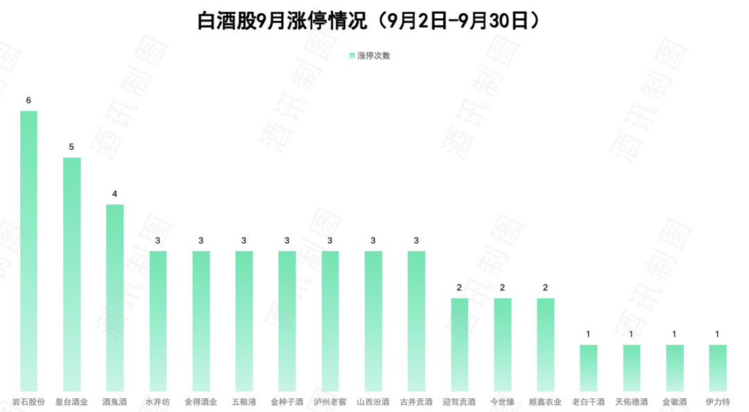 9月以来,白酒板块迎来涨停潮。酒讯统计了解到,20只白酒中有17只在9月录得过涨停,其中岩石股份、皇台酒业、酒鬼酒三家涨停次数最多,月内涨停次数分别为6次、5次、4次。值得注意的是,9月26日,白酒板块17只个股迎来涨停,其中岩石股份录得6天4板,皇台酒业录得3天两板。