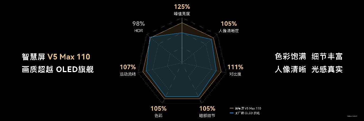 华为智慧屏 V5 Max 110厚积薄发,配备了超凡的Super MiniLED屏幕——华为黑钻屏,该屏幕采用黑钻聚能SuperMiniLED、多晶量子点膜、黑钻超维场液晶技术、黑钻全景臻彩液晶补偿、纳米复合低反膜等技术手段,使得显示屏拥有了高亮度、高色域、高对比、广视角、超低反射五大核心优势。华为智慧屏 V5 Max 110精确控光分区,峰值亮度达到5000nits,在强光环境中屏幕上的内容依然清晰可见。DCI-P3 125%、BT2020 91%的超广色域,加上日本前索尼专家调优、自动PQ调试调色,带来电影级的显色能力。