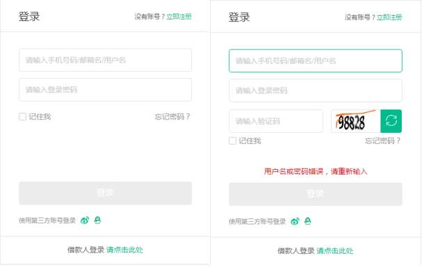 另一种情况是目前大部分产品采用的设计,在用户输入用户名或登录密码错误超过设定次数时,图形验证码出现。这种设计的内在逻辑是用户输入错误多次,我们会判断是否是机器人在测试数字密码,这时候我们就用图形验证来挡掉机器的攻击。
