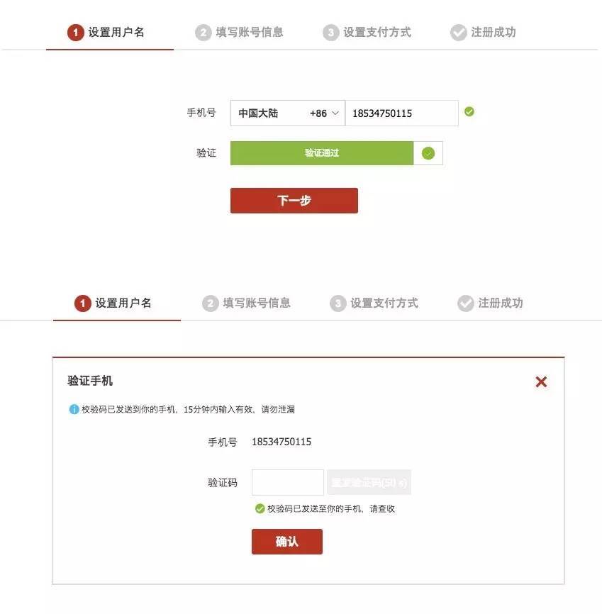 当绑定手机号在注册流程里时,下面一定会跟随短信验证环节。这个时候图形验证码和短信验证同时存在的设计就有几种情况了。