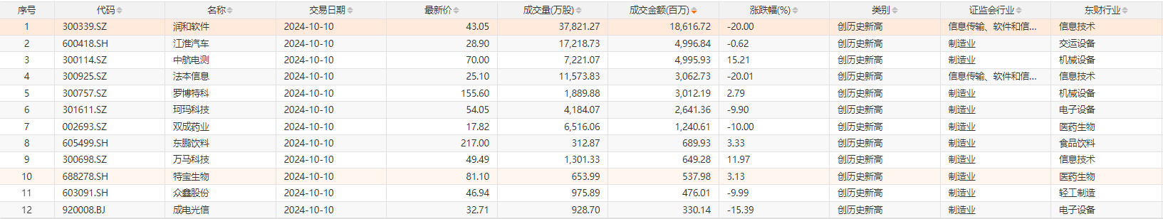 Choice数据统计,今日共有12只个股股价创历史新高,主要分布在电子设备、信息技术等行业,包括润和软件、江淮汽车、珂玛科技等。
