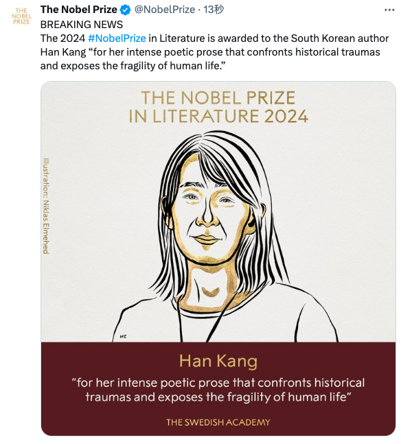 北京时间10月10日19时许,2024年诺贝尔文学奖揭晓,韩国作家Han Kang(韩江)获奖。