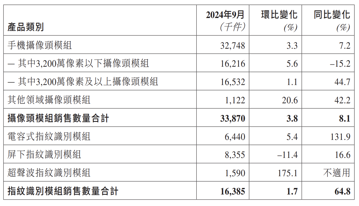丘钛科技10月10日在港交所公告,9月手机摄像头模块销售量为3274.8万件,同比增长7.2%;摄像头模块销售数量合计3387万件,同比增长8.1%。