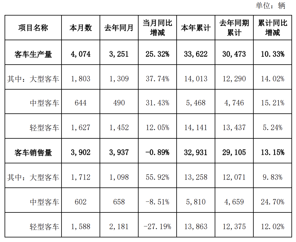 金龙汽车10月10日公告,9月份客车销售量为3902辆,同比下降0.89%;本年累计客车销售量为3.29万辆,同比增长13.15%。