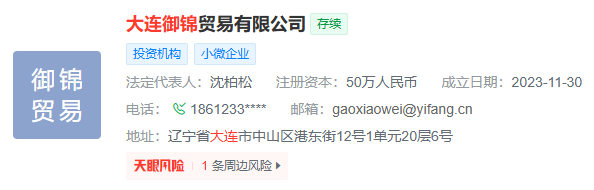 天眼查显示,大连御锦成立于2023年11月,主营业务为国内贸易代理等。其唯一股东为北京一方明实信息技术有限公司(下称“北京一方”),后者由大连一方100%持股。大连一方主要业务为房地产开发、资本投资、经营性物业投资,大连人孙喜双担任公司董事长兼总经理,也是实控人。