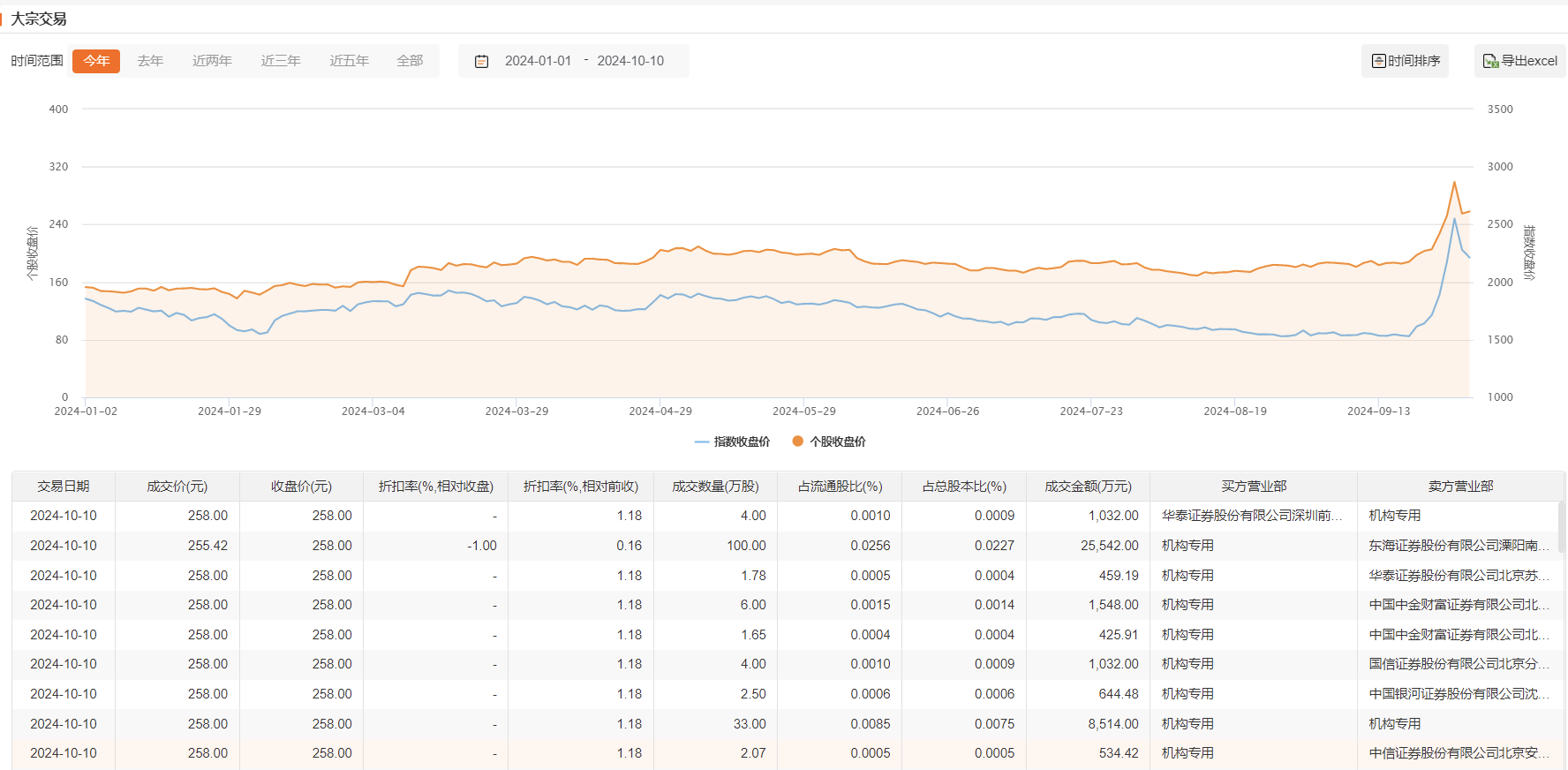 10月10日,宁德时代今日大宗交易成交155万股,成交额3.97亿元,占当日总成交额的2.45%,成交均价256.34元,较市场收盘价折价0.64%,其中最高成交价258元,最低成交价255.42元。
