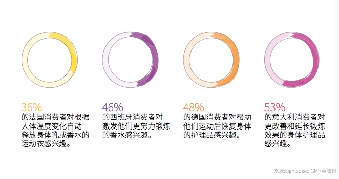 创新的方面包括在温度和包囊结构方面做文章,比如受热时融入肌肤、变冷时形成保湿滋养屏障的产品可能会受欢迎,这类产品更适合在高温房间中练习热瑜伽、热普拉提时使用,为高强度训练设计的产品可采用包囊结构,通过摩擦或温度变化释放产品中的活性成分和香水,满足皮肤不同时间的需求。