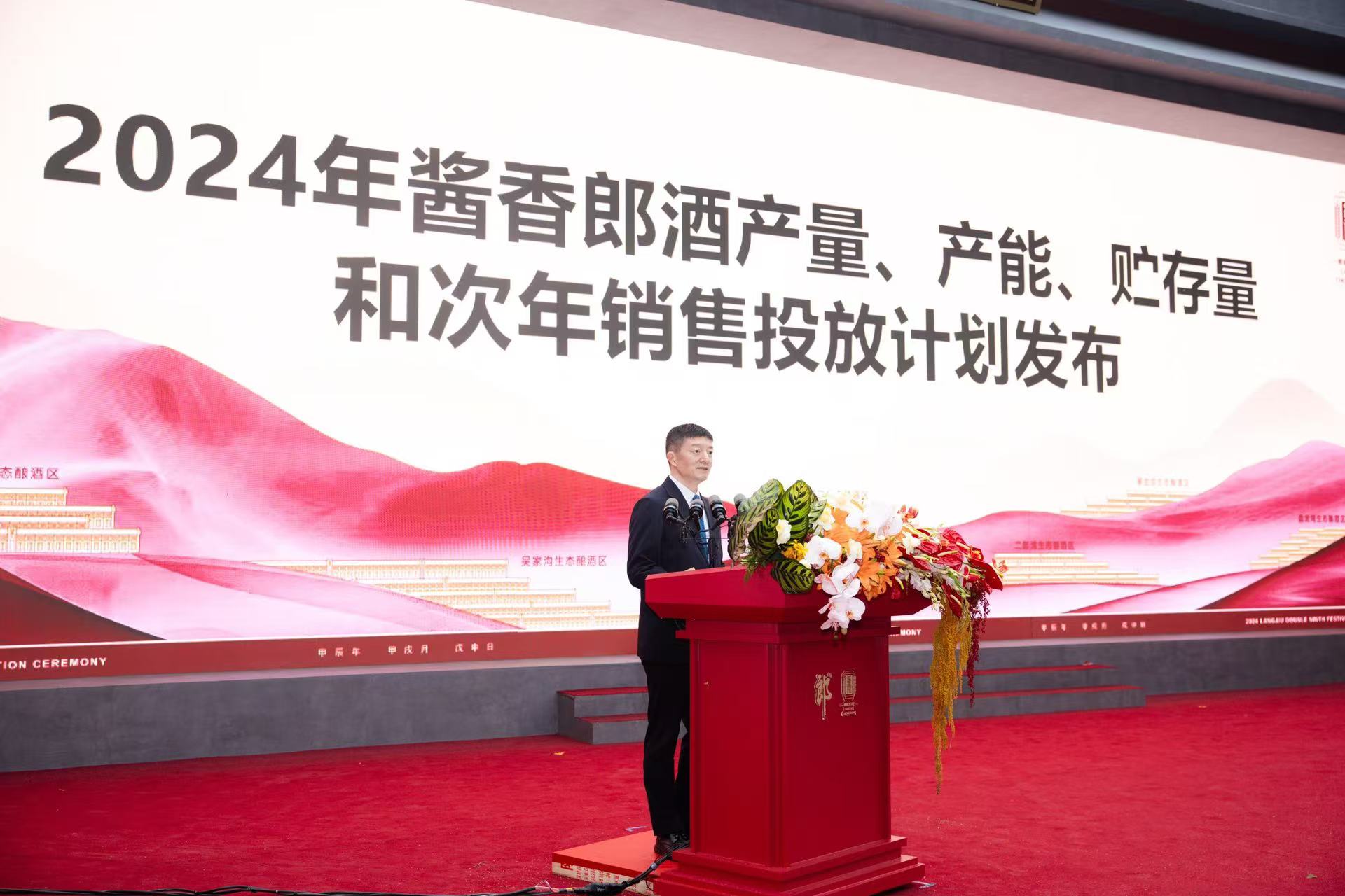 10月11日,2024郎酒重阳下沙大典现场,郎酒股份公司常务副总经理、销售公司总经理梅刚发布2024年酱香郎酒产量、产能、贮存量和次年销售投放计划。