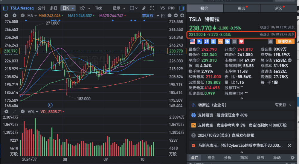截至特斯拉10月10日美股收盘,特斯拉股价报238.77美元/股(约合人民币1690元/股),微跌0.95%,总市值为7628亿美元(约合人民币54005亿元)。