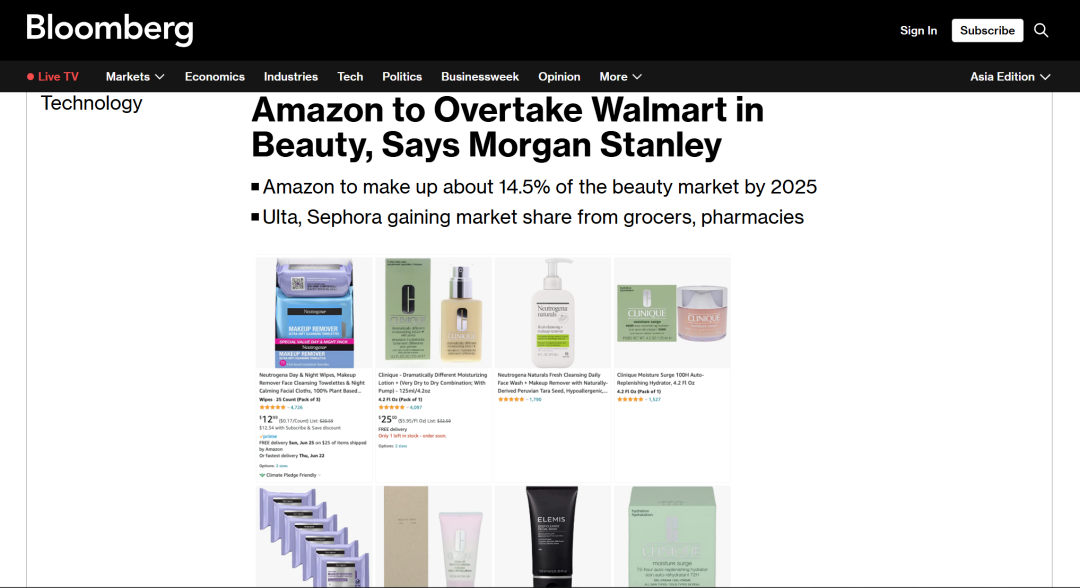 据摩根士丹利预测,亚马逊将在明年(2025年)成为美国最大的美妆零售商,实际上,这一平台也正在吸引越来越多高端美妆品牌与巨头的目光,如欧莱雅集团旗下科颜氏、兰蔻及Urban Decay;雅诗兰黛集团旗下倩碧以及资生堂集团等均已入驻亚马逊。