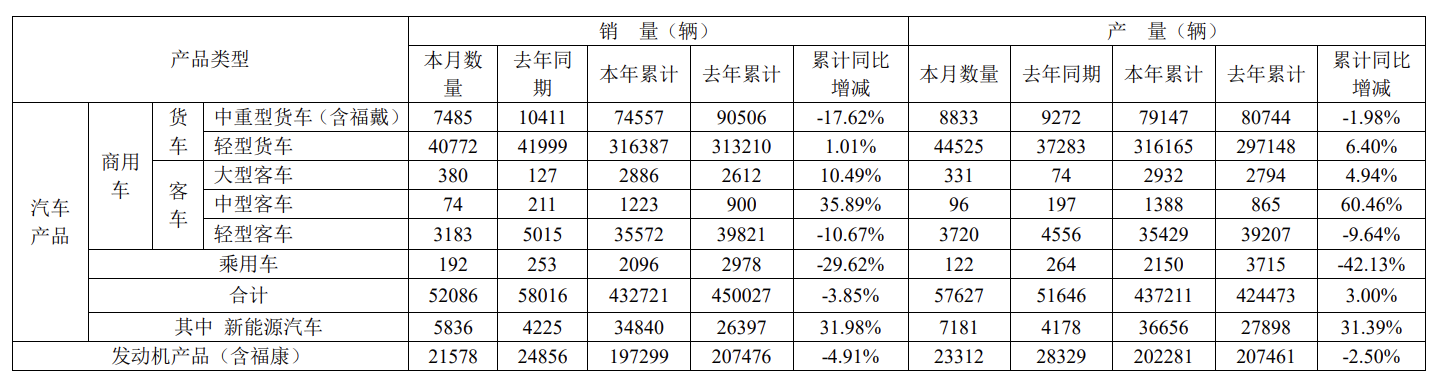 福田汽车:前三季度汽车产品累计销量43.27万辆,同比下降3.85%