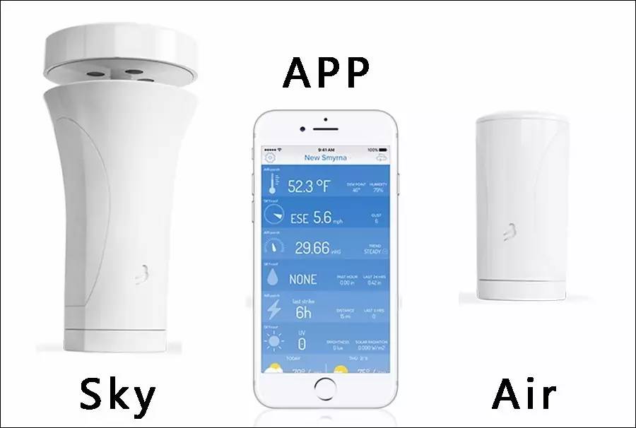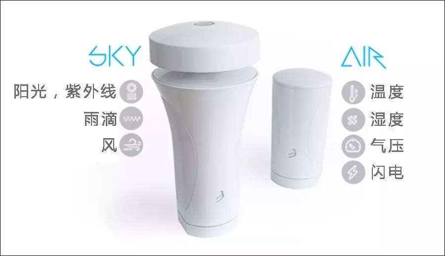 装置由 3 部分组成,Sky 和 Air 检测 7 项专业级气象数据,配套 APP显示数据,即时通知。