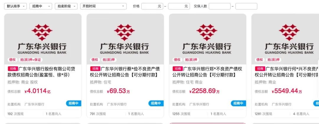阿里司法拍卖平台显示,华兴银行一笔本息合计约4.01亿元的不良资产债权正在打包转让,转让时间为9月30日至12月31日。竞买公告显示,该笔债权的标的物是广东华兴银行持有的两户债权,包括深圳市盈富恒实业集团有限公司在该行的3.1亿元贷款本金余额、9100万元欠息,以及个人债务人徐某在该行的18.82万元贷款本金及1.4万元欠息。