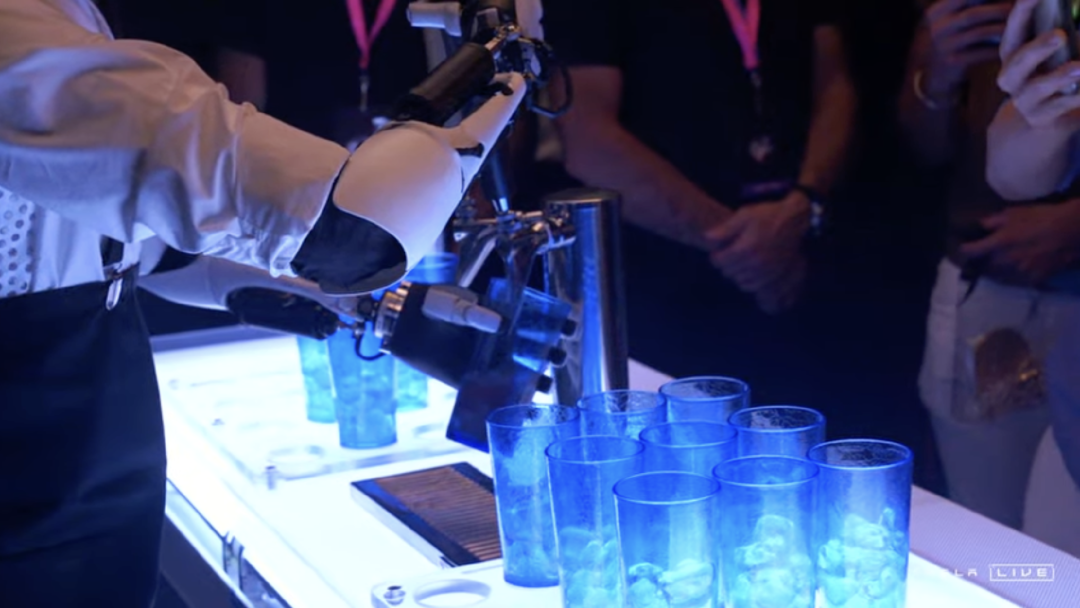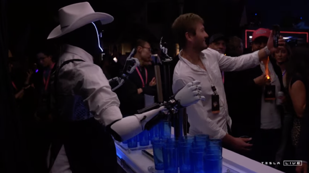 人形机器人Optimus这次则展示了许多更加拟人的功能,不仅可以充当酒保为用户接饮料,还能与用户对话,并在用户自拍时摆出手势配合。