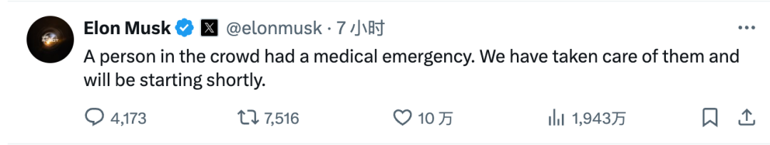 在今天原定的发布会正式开始之前(北京时间 10 月 11 日 10 点),全球各地的媒体记者、汽车行业人士以及科技爱好者们又在屏幕前苦等了一个小时,发布会才正式开始。马斯克在社交平台 X 上解释说,现场人群中有人突发疾病,他们为此耽误了一些时间。