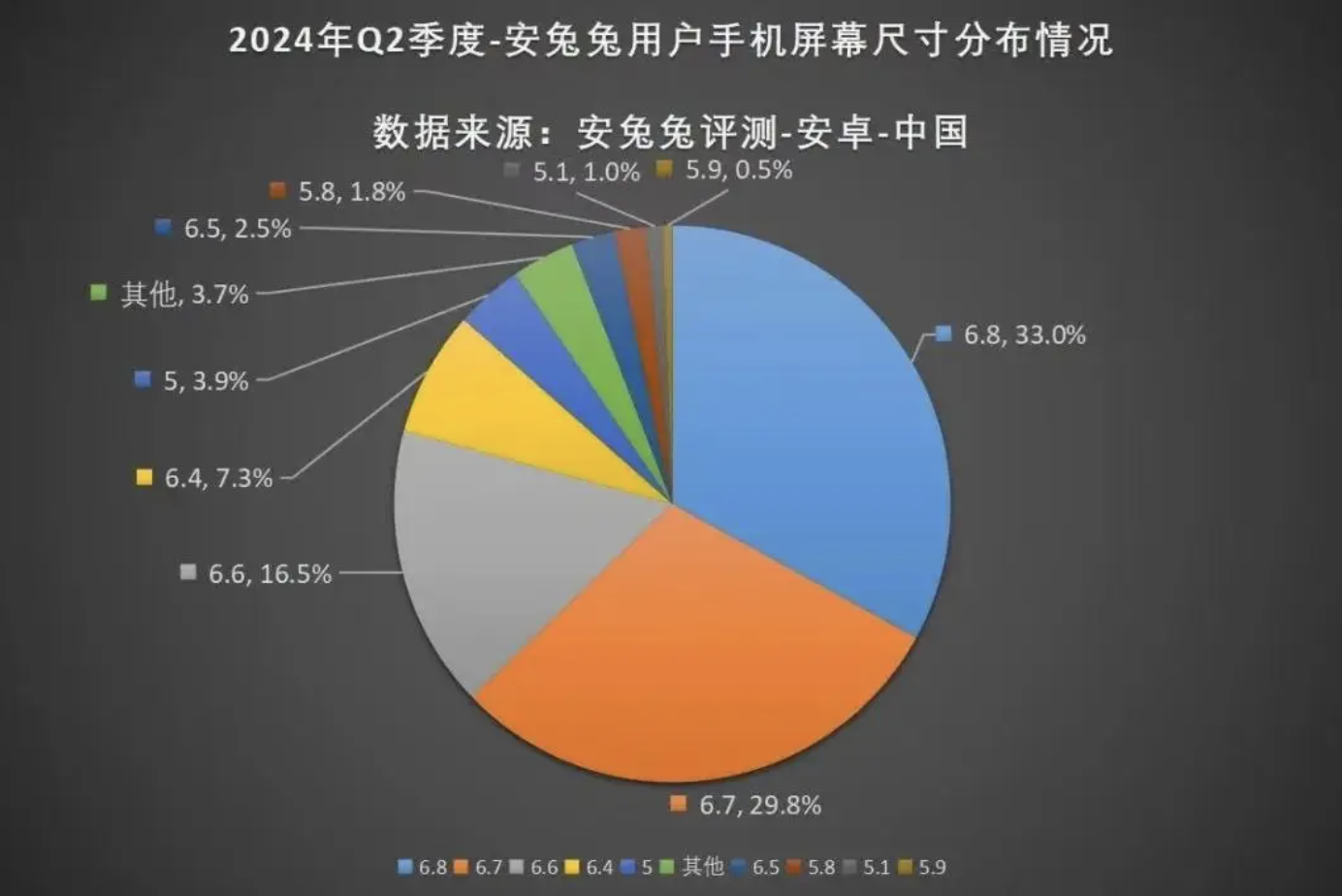 安兔兔评测发布的2024年第二季度手机屏幕尺寸分布情况显示,国产手机中,6.6-6.8英寸屏幕的手机占比已经达到79.3%。
