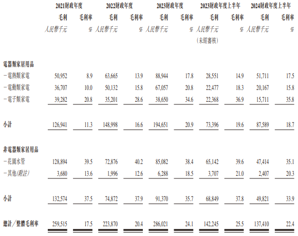 2024年上半年,香江电器毛利率从2023年上半年的25.5%减少至22.4%。该公司解释称,这主要由于高毛利率的花园水管及电动类家电的利润率减少;花园水管及电动类家电的两者销售总额于2023年上半年及2024年上半年分别占总销售额51.6%及42.7%。