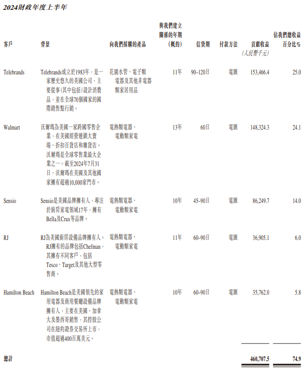报告期内,该公司大客户比较集中。2021年至2023年及2024年上半年,香江电器来自前五大客户的销售占公司总收益比例分别是62.4%、62.4%、72.4%及74.9%,其中第一大客户销售占总收益比例分别为27.1%、21.3%、28.5%及25%;另外公司花园水管的唯一客户Telebrands分别占总收益的22%、16.5%、18.7%及22%。