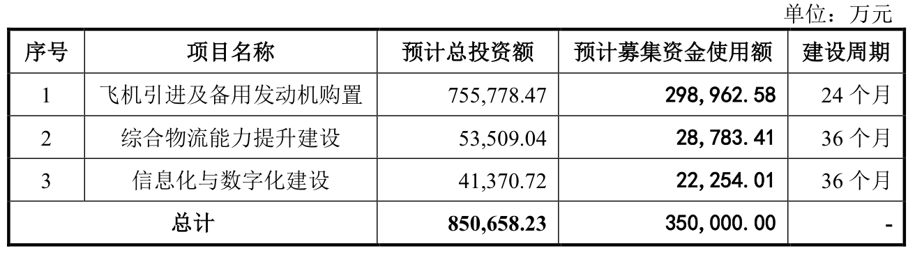 值得留意的是募资规模,根据2023年3月的申报稿,最初国货航预计募资65.07亿元,将投入“飞机引进及备用发动机购置”55.58亿元,建设期24个月;投入到“综合物流能力提升建设”5.35亿元,建设期36个月;投入到“信息化与数字化建设”4.14亿元,建设期36个月。