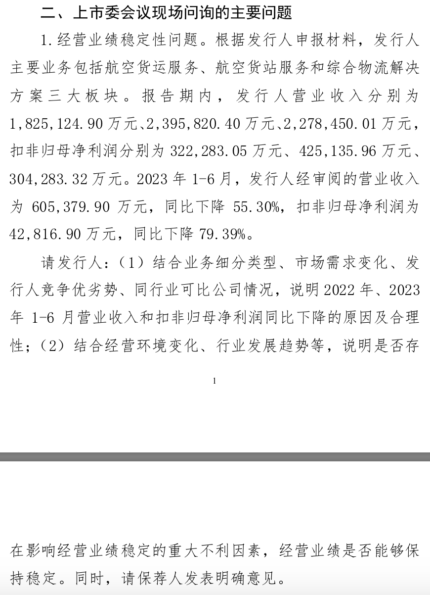 此前在上会时,上市委就曾提及公司经营业绩稳定性问题。因为当时看2023年上半年国货航的营业收入同比下滑了55.3%,扣非净利润同比下滑了79.39%。