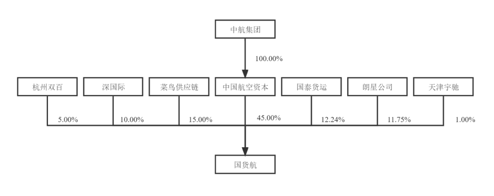 国货航的控股股东是中国航空资本,中国航空资本直接持股45%股权,实际控制人中航集团,中航集团持有中国航空资本100%股权。