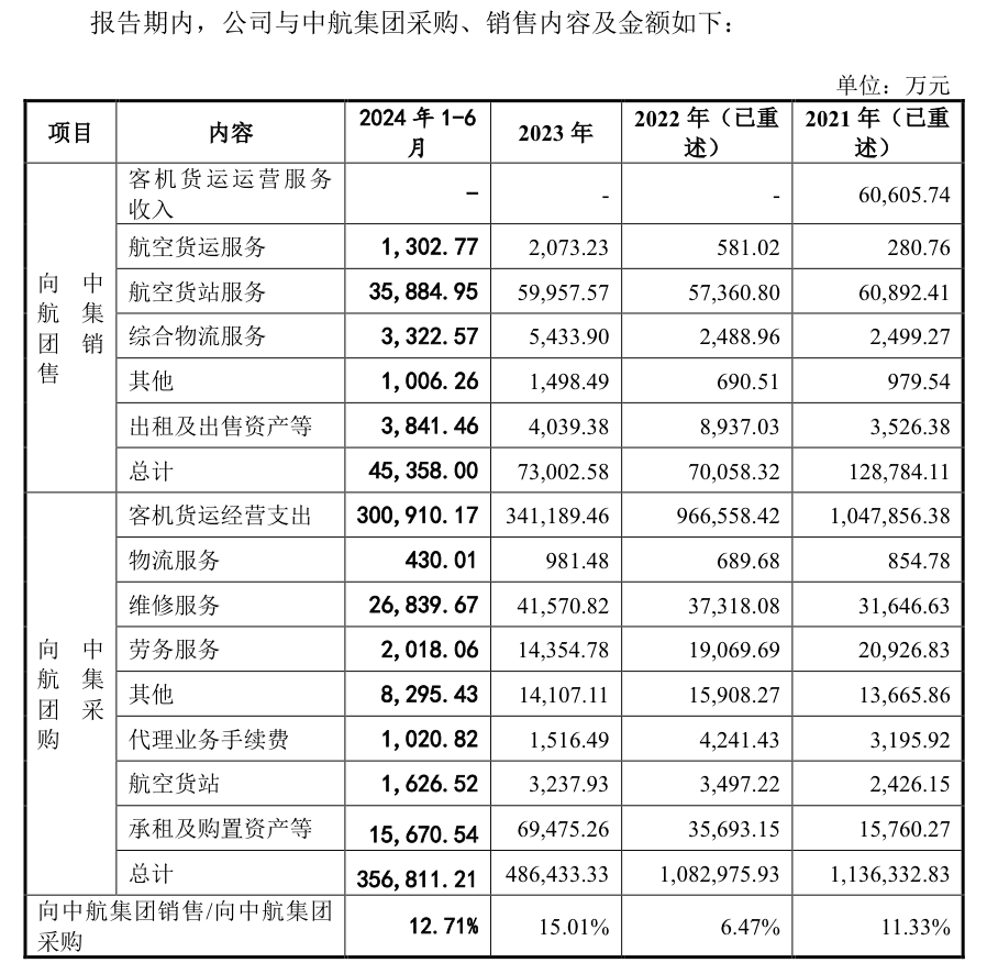 说明书显示,2023年和2024年上半年,国货航向中航集团销售额分别为7.3亿元和4.54亿元,向中航集团采购额分别为48.64亿元和35.68亿元。